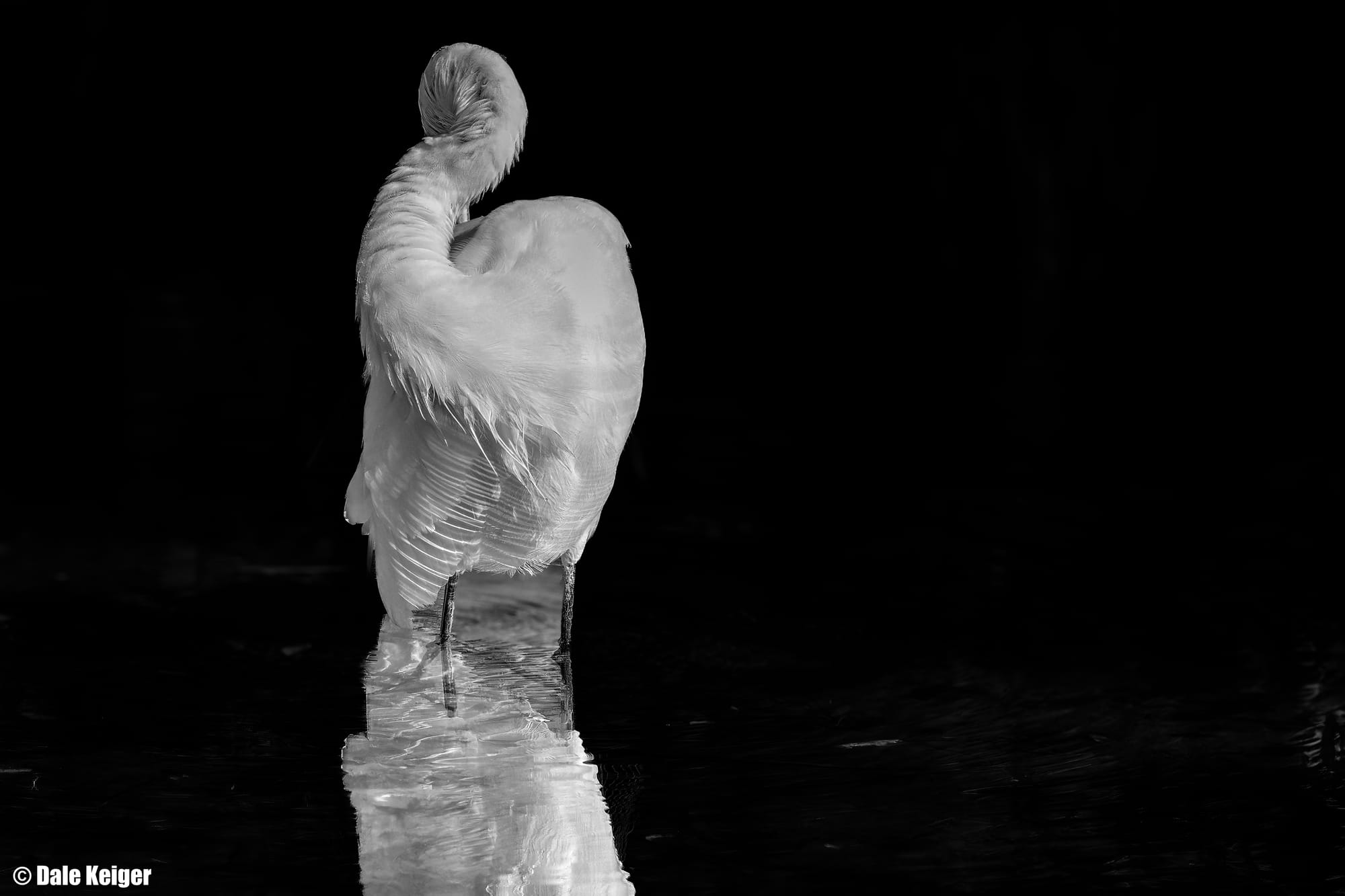 The solution—my solution, at any rate—was to eliminate the distraction of color and craft a monochrome image. I converted the picture to grayscale and pulled down the light on the water until it was black, except for the bird’s reflection. I accentuated certain elements by filtering the red end of the spectrum. I didn’t want the viewer to glance at the picture and think, egret. I wanted the viewer to gaze at the image and respond, without rational thought, to the sinuousness of the bird’s body and the complex texture of the feathers. I was delving information for beauty.