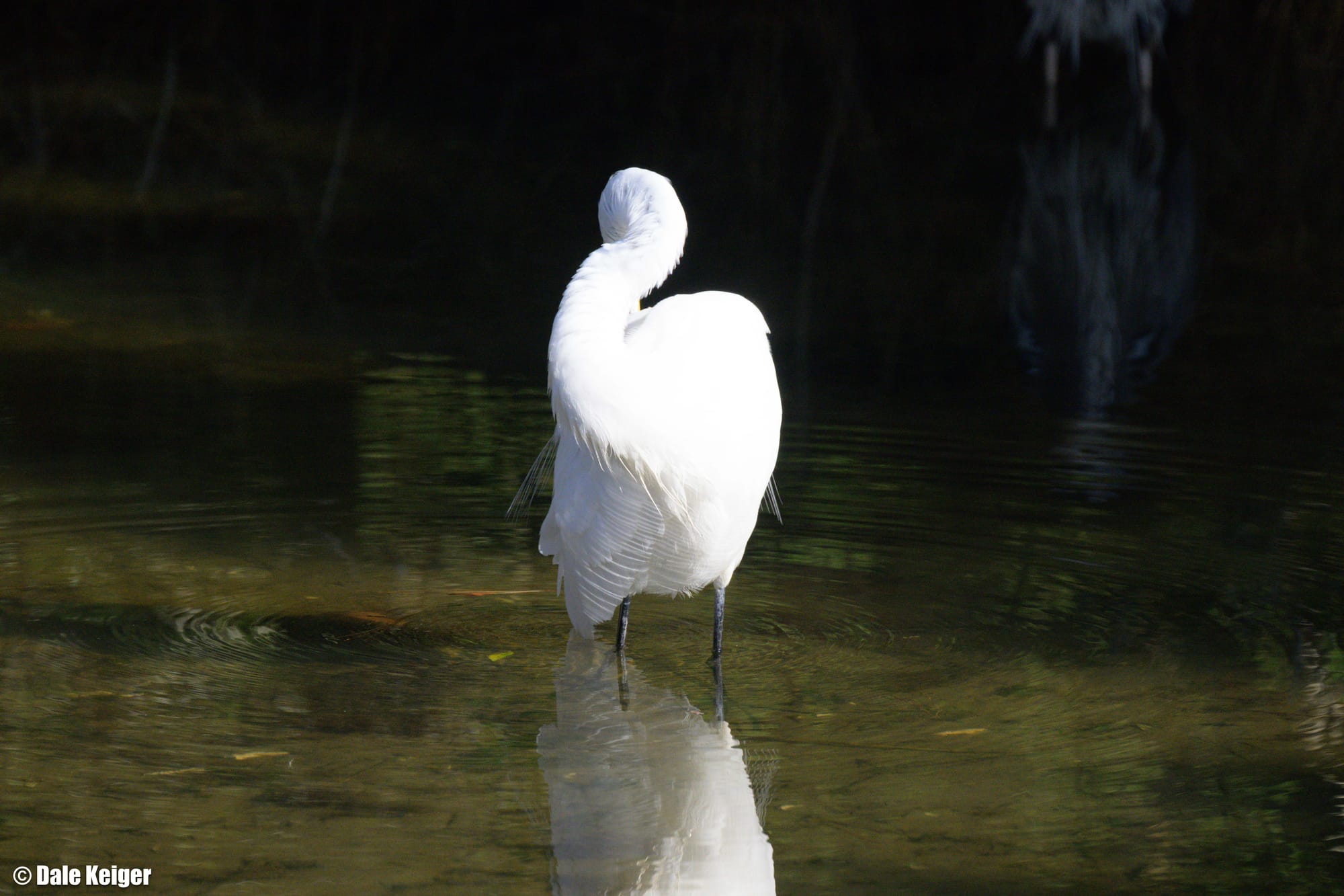 Let’s use an example from my recent trip. Egrets mostly stand still, but they also scratch and stretch and preen. (And they kill a lot of fish. Much different photographic outcome.) After my trip, as I sorted dozens and dozens of egret pictures, this one snagged my attention because of the rounded contours of the bird’s body in this unusual posture. Egret geometry is often sharp and angular, especially around its head. But this image was all soft curves and feathery roundness, without the predatory menace of the beak and eyes. Plus there was a visually interesting reflection. I sized it up on my computer screen and thought, There might be something here.