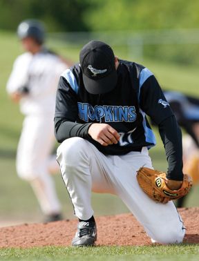 I was reminded of all this by a photograph on the front page of the Baltimore Sun’s May 28, 2008 sports section. In the picture, shot by Associated Press photographer Dan Powers, Johns Hopkins pitcher Matt Wiegand kneels, head down, every aspect of his posture expressing anguish because he has just walked in the tying run in the final game of baseball’s College World Series. Next he walked in the winning run. One bad pitch, one national championship gone for good. When I picked up that morning’s paper, I already knew the final score—Trinity College 4, Johns Hopkins 3. But when I saw that picture, my heart sank. Individual players don’t lose games. Teams lose games. But at that instant no one could have convinced Wiegand that he had not just thrown away a national championship.